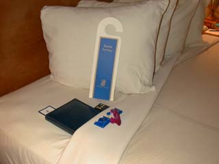 At the Ritz-Carlton, people come into your room whenever you're out and move stuff around. Here, we return to find a leather-bound version of the TV Guide under our blanket, complete with bookmark inserted in today's listings. That other stuff is an orchid, two chocolates, and the TV remote. Creepy. |