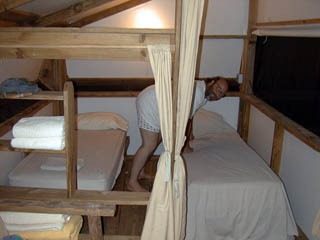 Restless sleepers should seek other accomodations. Doug makes up his bed in the "bedroom" portion of the tent. Tents come with lights and electricity, a fan, cookstove, ice chest and dishes. Running water and bathrooms are down the boardwalk.