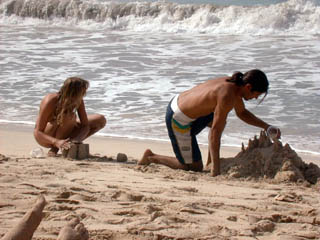 A couple frolic on the beach, cementing their relationship, like so many grains of sand, into a solid oneness, however temporary...bleech. These two can also be seen in the panoramic view from Magen's Beach, standing behind Karen, who's jotting down notes while sitting on a red towel covered chaise longues. |