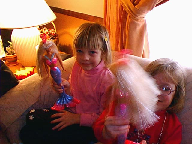Morgan demostrates why Mermaid Barbie has long hair. For twirling!